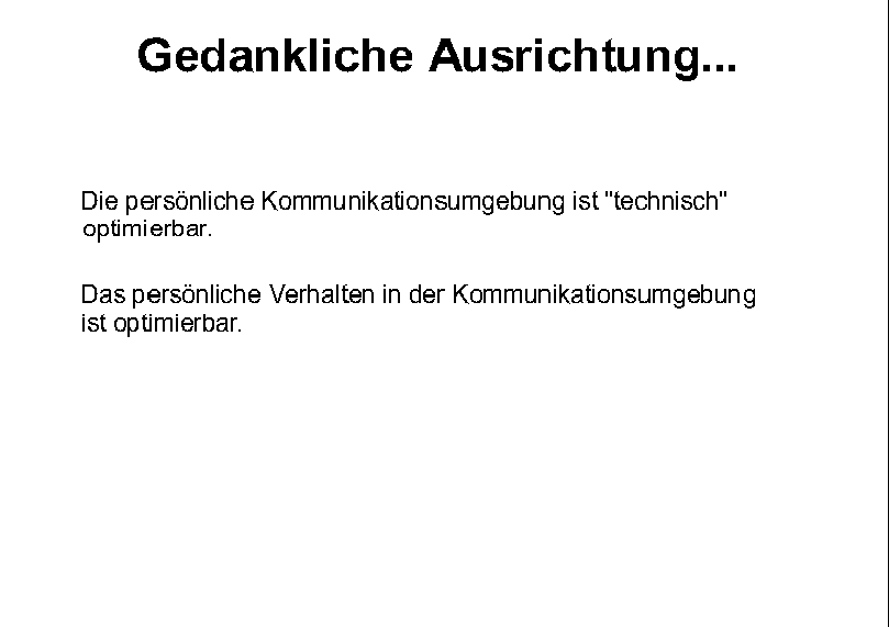 Optimieren ist hier verstanden als die M”glichkeit, die Anstrengung fr den Weg zum Ziel einer "ungest”rten" Kommunikation zu minimieren, um so bei allen Beteiligten mehr Zufriedenheit ber die Ergebnisse zu erzeugen.