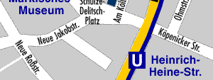 Von der A13 kommend läßt man die A10 gleich links liegen und fährt geradezu über die A113 nach Berlin rein. Von der A12 kommend fährt man zunächst auf die A10 und biegt dann am Schönefelder Kreuz auf die A113. Die A113 geht nach einer Weile in die B96a (Richtung Berlin Zentrum) über. Die Bundesstraße fahrt Ihr bis zum Erbrechen geradeaus, folgt dem eleganten Schlenker um den Treptower Park, ohne die Vorfahrtstraße zu verlassen, bis Ihr unter einer S-Bahn-Brücke hindurchkommt. Ab hier müßt Ihr wiederum einfach gnadenlos geradeaus fahren. Die Straße ändert mehrmals den Namen: Puschkinallee, Schlesische Straße, Köpenicker Straße. Gegen Ende der Köpenicker Straße kreuzt Ihr die Brückenstraße/Heinrich-Heine-Straße bei der U-Bahn-Station "Heinrich-Heine-Straße". Jetzt noch genau eine Querstraße weiterfahren und dann rechts in die Straße Am Köllnischen Park abbiegen. Here you are.